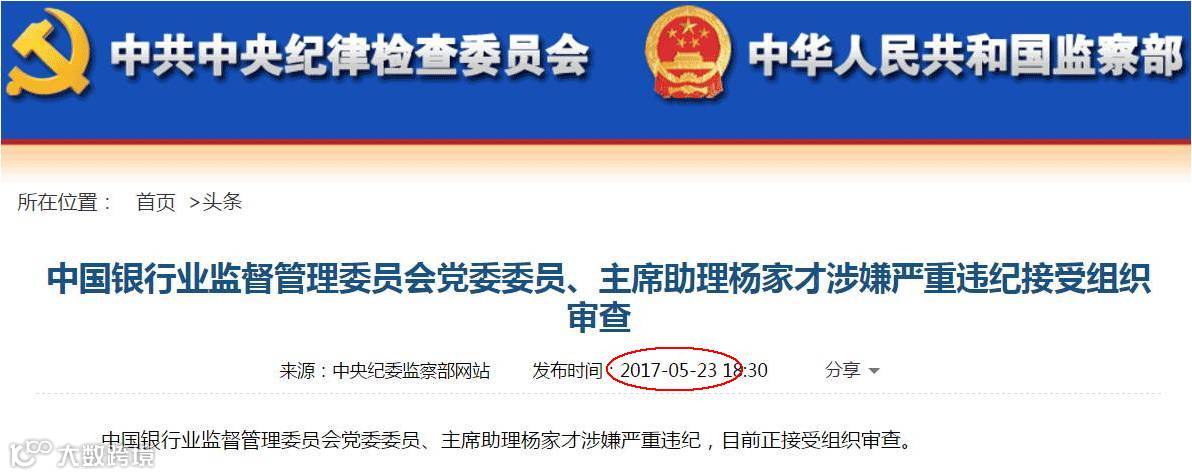 项俊波被查的官方消息公布不久,就传出银监会党委委员、主席助理杨家才被协助调查。5月23日,中纪委官网报道坐实传言,杨家才涉嫌严重违纪,已经接受组织审查。