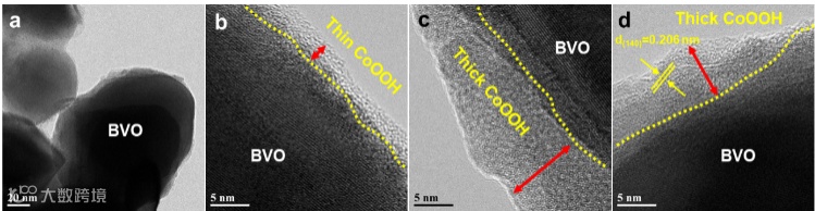 TEM形貌观察不同时间下的助催化剂的厚度与初始状态相近,表明F-抑制了OEC在表面的不均匀原位生长,避免了空穴跨过OEC层转移的长距离以及界面处的电子-空穴复合,大幅度提高了光生载流子的迁移。