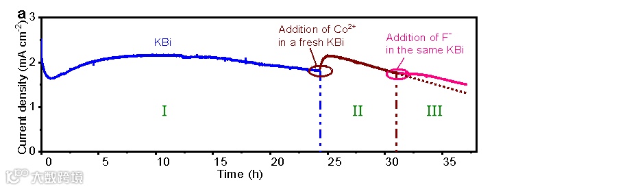 图4. (a) Co(CO3)xOHy/BVO电极在KBi中的J-t曲线,约24小时后,在新鲜的KBi中依次添加Co2+ (0.5 μL) 和F- (0.5 μL)后的J-t曲线;(b-d) Co(CO3)xOHy/BVO分别在 (b) KBi+Co, (c) KBi+Fe,及(d) KBi+Ni中的J-t曲线。测试中分别在一定时间内向电解液中引入F离子的J-t曲线。所有测试均在0.6 VRHE下进行。