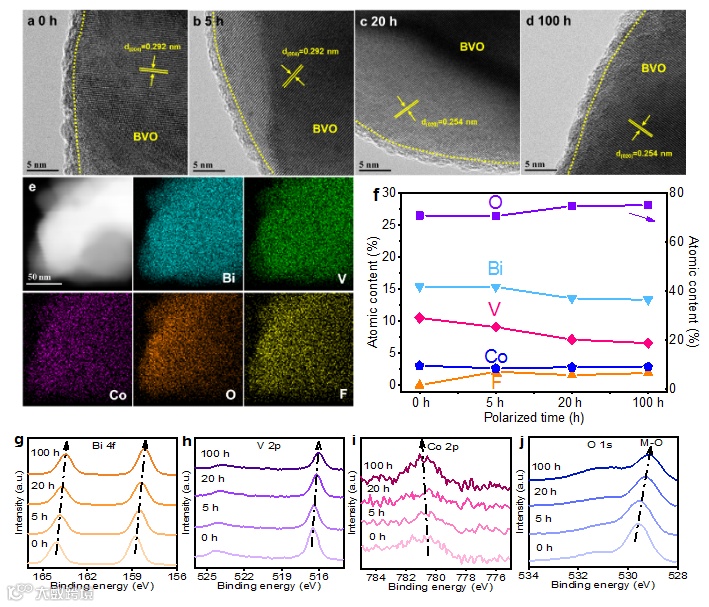 图3. (a-d) Co(CO3)xOHy/BVO在KBi+F中不同时间的TEM图像:(a) 0 h,(b) 5 h,(c) 20 h和 (d) 100 h; (e) 电极在100 h后的TEM-EDS图像;(f) 电极中Bi,V,Co,O和F的原子含量随时间的变化;(g-j) XPS Bi 4f (g),V 2p (h),Co 2p (i)和O 1s (j)结果。