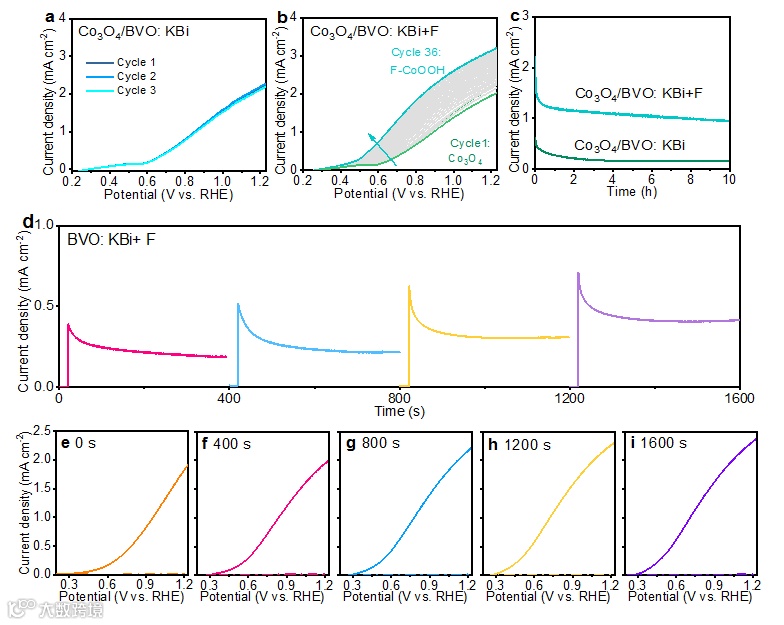 图5. (a) Co3O4/BVO电极在KBi中的J-V曲线;(b) 在不同扫描周期下,Co3O4/BVO电极在KBi+F中的J-V曲线;(c) Co3O4/BVO及F:CoOOH/BVO电极分别在KBi和KBi+F中的J-t曲线;(d) BVO在0.6 VRHE下,KBi+F中的J-t曲线; (e-i) 在不同时间进行J-t测试时, BVO在KBi+F中的J-V曲线。