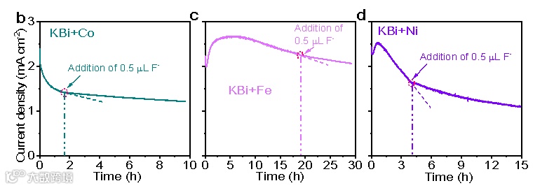 为了进一步探索使用添加剂F-进行的原位OEC活化和蚀刻/钝化过程,我们研究了J-t测量过程中电解质中引入各种阳离子(Fe2+,Ni2+或Co2+)的动态反应。