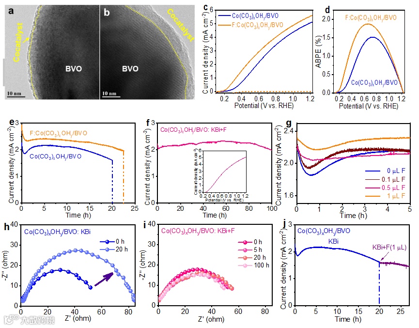 图1. (a-e) Co(CO3)xOHy/BVO和F:Co(CO3)xOHy/BVO形貌和在KBi电解液中电化学性能; (f,g) Co(CO3)xOHy/BVO在KBi+F电解液中电化学性能; (h,i) Co(CO3)xOHy/BVO分别在KBi和KBi+F中电化学阻抗; (j) Co(CO3)xOHy/BVO在KBi电解液中引入F的稳定性能测试。