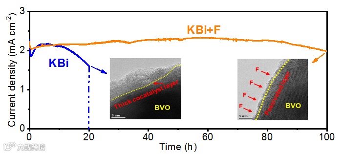 在BVO表面修饰Co(CO3)xOHy催化剂,可以显著提高BVO光电催化性能。之后在Co(CO3)xOHy中引入F-,F掺杂提高助催化剂活性,进一步提高BiVO4的光电流密度。