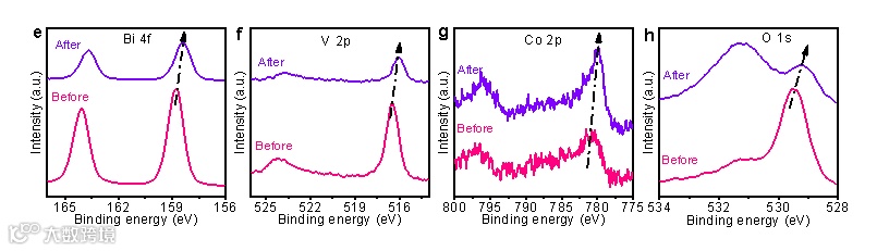 图2. (a-d) J-t在0.6 VRHE下,测量20小时后,KBi中Co(CO3)xOHy/BVO的TEM图像,助催化剂溶解或生长;(e-h) XPS, (e) Bi 4f,(f) V 2p,(g) Co 2p和 (h) Co(CO3)xOHy/BVO的O 1s光谱,在AM 1.5G照明下在KBi中进行J-t测量之前和之后。