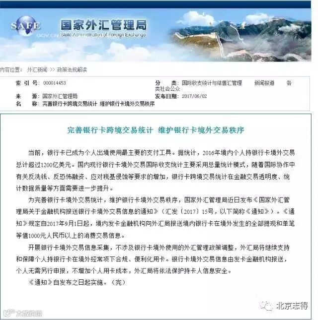 日前,外汇局发布金融机构报送银行卡境外交易信息的通知,要求采集境内银行卡在境外发生单笔1000元以上消费交易信息。银行卡境外交易采集自2017年9月1日起施行。