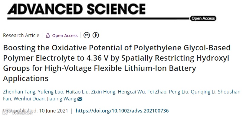Zhenhan Fang, Yufeng Luo, Haitao Liu, Zixin Hong, Hengcai Wu, Fei Zhao, Peng Liu, Qunqing Li, Shoushan Fan, Wenhui Duan, and Jiaping Wang*. Boosting the Oxidative Potential of Polyethylene Glycol-Based Polymer Electrolyte to 4.36 V by Spatially Restricting Hydroxyl Groups for High-Voltage Flexible Lithium-Ion Battery Applications, Adv. Sci. 2021,2100736