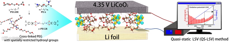 基于此,来自清华大学物理系的王佳平教授团队,在国际知名期刊Advanced Science上发表题为“Boosting the Oxidative Potential of Polyethylene Glycol-Based Polymer Electrolyte to 4.36 V by Spatially Restricting Hydroxyl Groups for High-Voltage Flexible Lithium-Ion Battery Applications”的研究文章。