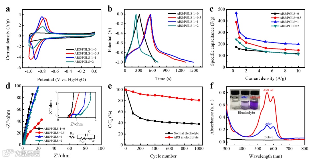 图3. 在6 M KOH作为电解质的三电极系统中测得的具有不同ARS:PGLS-1质量比的复合电极的电化学性能。(a)在-1-0 V的电位范围内,扫描速度为5 mV s-1的CV曲线。(b)在0.5 A g-1的电流密度下的GCD曲线。(c)在不同电流密度(0.5–10 A g-1)下的比电容。(d)在开路电势下从100 kHz到0.001 Hz记录的EIS谱图,以及在高频区域的放大倍数和等效电路图(插图)。(e)在含有80 mg mL-1 ARS的电解质和不含ARS的电解质中循环1000次过程中,ARS / PGLS-1= 0.5复合电极的电容保持率。(f)循环前后电解液以及ARS/PGLS-1 = 0.5样溶解在电解液的参考样品的UV-vis光谱(ARS ref.)。