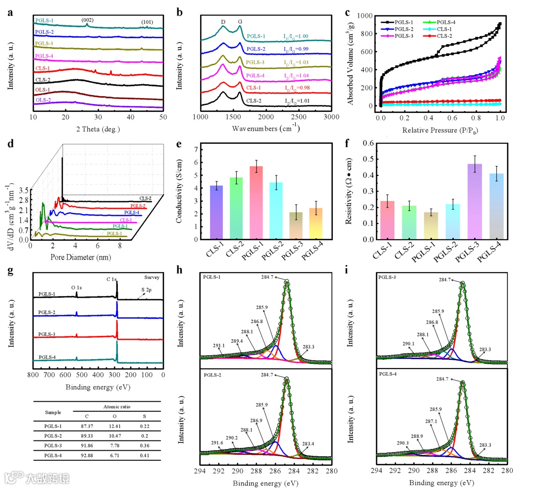图2.结构、导电性和XPS表征。XRD(a)和Raman(b)研究了PGLS和CLS样品的石墨化程度。PGLS和CLS样品的N2吸附-脱附等温线(c)和NLDFT模型中的孔径分布(d)。PGLS和CLS样品的电导率(e)和电阻率(f)。PGLS-1、PGLS-2、PGLS-3和PGLS-4样品的XPS测量光谱(g)和相应的原子比(下半部分),(h) PGLS-1和PGLS-2以及(i)PGLS-3和PGLS-4的高分辨C 1s谱图。