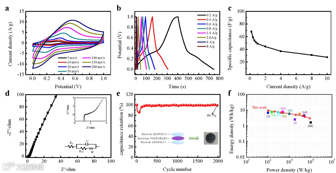 图4.基于ARS/PGLS-1=1的SPRS在PVA/KOH/ARS凝胶电解质中的电化学性能。(a)在-1-0 V范围内以不同扫描速率收集的CV曲线;(b)在-1-0 V范围内从0.2A g-1到8A g-1记录的GCD曲线;(c) 在不同电流密度下的SPRS比电容;(d)在开路电位下从100kHz到0.001 Hz记录的交流阻抗谱以及高频区的放大倍数和等效电路图。(e) 2A g-1下2000次循环的电容保持率和使用PVA/KOH/ARS凝胶电解质的SPRS制备示意图(插图)。(f)基于ARS/PGLS-1=1的SPRS的Ragone曲线图以及与以前报道的生物质基超级电容器性能的比较。
