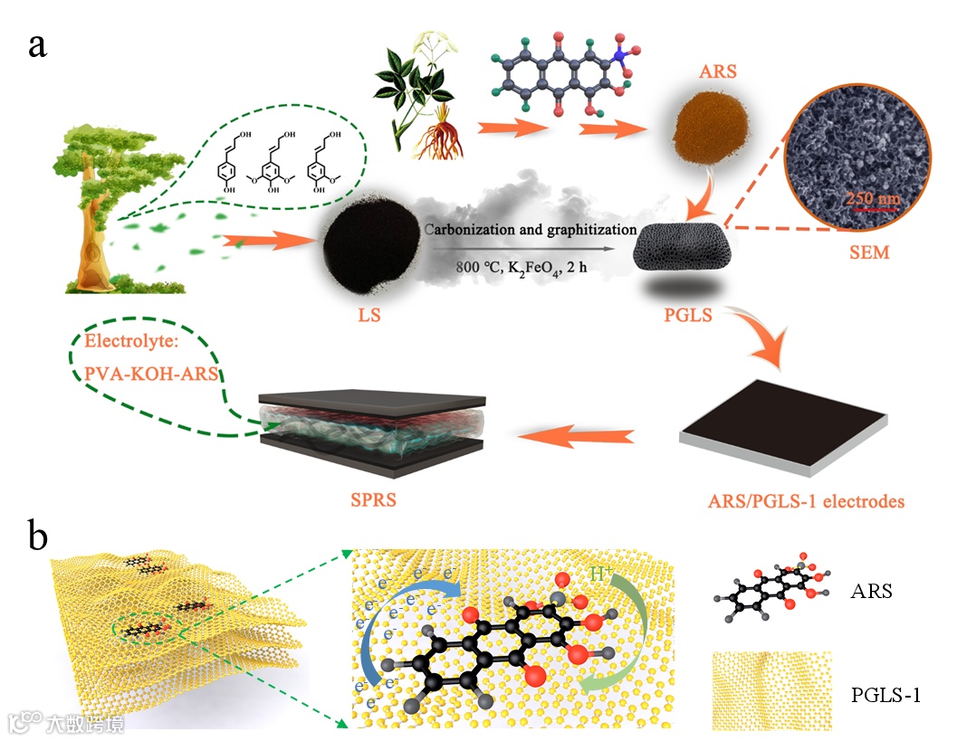 该文章报道一种由木质素磺酸钠衍生的分级多孔石墨碳(PGLS)和有机氧化还原化合物(茜素)组成的混合体系电极。其中茜素衍生物“茜素红磺酸盐”(ARS)可提高该混合体系的储能能力,而使用K2FeO4对木质素磺酸钠实现同步碳化和石墨化制备的多孔石墨化炭材料(PGLS-1),可提供用于大量电荷传输和ARS自组织的连续3D石墨化多孔碳骨架,同时也改善了传统赝电容体系的循环稳定性。