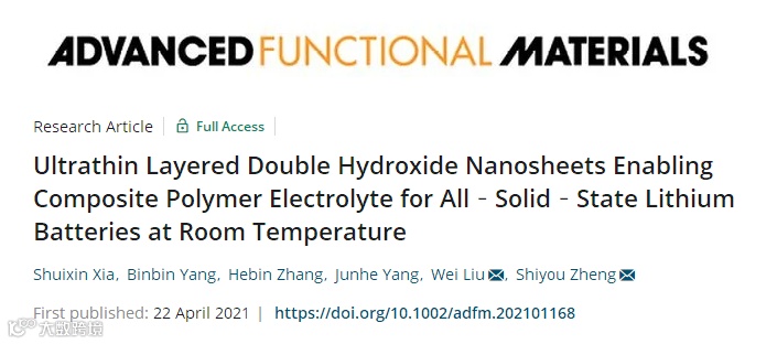 基于此,上海理工大学郑时有教授研究组与上海科技大学刘巍教授团队合作在国际顶级期刊 Advanced Functional Materials上发表题为“Ultrathin layered double hydroxide nanosheets enabling composite polymer electrolyte for all-solid-state lithium batteries at room temperature”的研究工作。