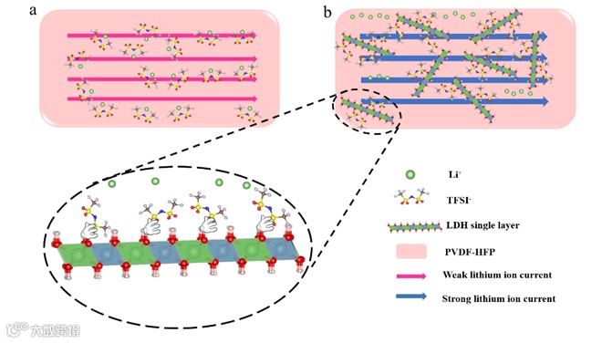 图1. 不同聚合物电解质中锂离子的传导机理。(a)纯PVDF-HFP电解质;(b)超薄水滑石纳米片促进的PVDF-HFP/SLN复合固体电解质