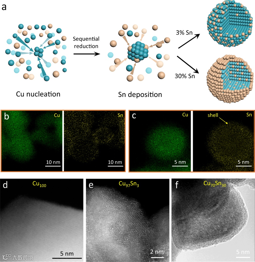 图1. 一步还原法合成Cu97Sn3单原子表面合金以及Cu70Sn30壳核合金。