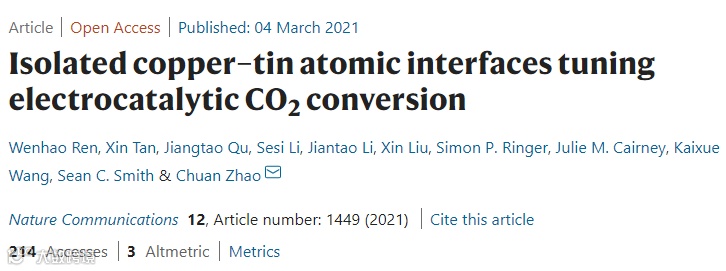 近日,来自澳洲新南威尔士大学的赵川教授,在国际知名期刊Nature Communications上发表题为“Isolated copper–tin atomic interfaces tuning electrocatalytic CO2 conversion”的论文。