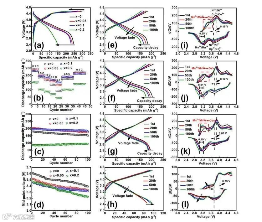 (3)阴极/阳极峰的电位间隔(3.87/3.70V)最小(0.08V),这表明电化学反应极化较低,有利于增强Li+扩散动力学。