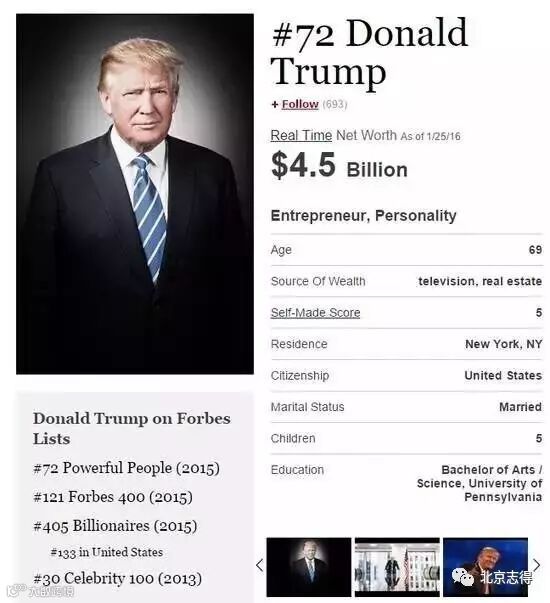 14亿美元,折合人民币约为95.6亿。即便在中国,他的排名也在300名开外,根据胡润百富榜2016年的排名,特朗普的资产如果在中国,应排在第345名。