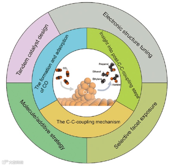 图1. 综述的提纲。首先概述CO2电还原的最新机理进展,包括CO的形成和吸附,C-C耦合机理以及对C-C耦合后反应路径的认识,然后讨论了设计铜基的催化剂的策略,即串联催化剂设计,电子结构调整,选择性小平面暴露以及分子/添加剂策略。