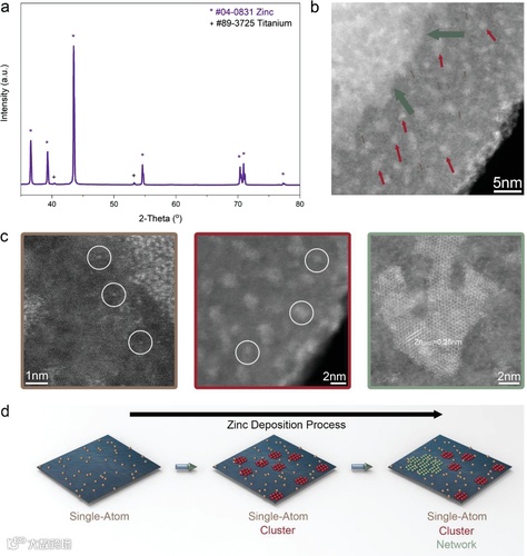 图1主体为外原位高分辨球差电镜对锌在碳基底上沉积的过程的研究,可以看到锌在碳基底上的沉积遵循锌单原子位点到锌团簇,然后再形成多孔锌网络的路径。