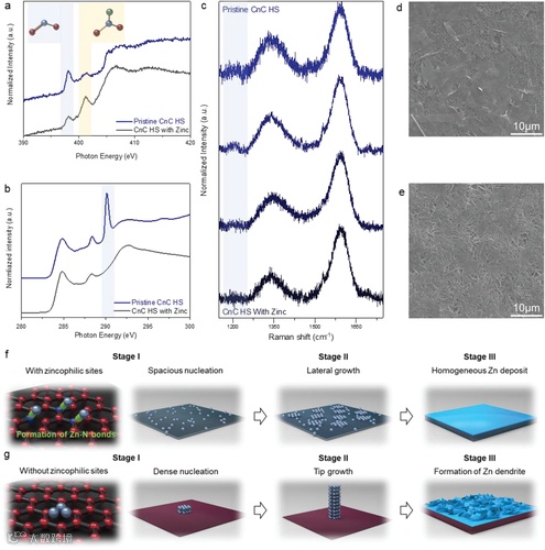这项工作采用多种原位和外原位技术对亲锌位点的反应机理进行研究。通过使用碳基体作为模型系统,研究人员表明了亲锌位点的反应关键是亲锌位点和锌离子之间的成键,这两者之间的键合调控了初始成核位点的分布,从而抑制了锌枝晶的生长。