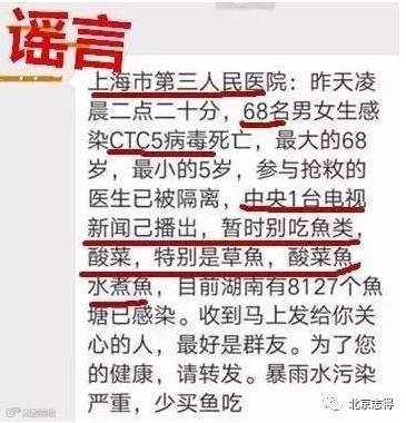 “上海市第三人民医院:昨天凌晨二点二十分,68名男女生感染CTC5病毒死亡,最大的68岁,最小的5岁,参与抢救的医生已被隔离,中央1台电视新闻己播岀,暂时别吃鱼类,酸菜,特别是草鱼,酸菜鱼,水煮鱼,目前湖南有8127个鱼塘已感染。收到马上发给你关心的人!”