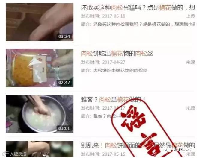这些视频中的所谓“检测方法”也都是将肉松泡水后形成白色絮状物,然后用撕扯或试图点燃来证明这是“棉花”,进而声称:这么多年人们吃的都是“棉花肉松饼”。