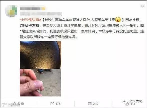 近日,杭州、长沙、合肥等多地出现传言称:最近许多座椅上有细小的针,很有可能有艾滋病人血液的针,大家骑的时候千万要注意!↓↓