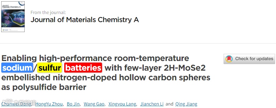 近日,来自吉林大学的蒋青教授、金波教授,在国际知名期刊Journal of Materials Chemistry A上发表题为“Enabling high-performance room-temperature sodium/sulfur batteries with few-layer 2H-MoSe2 embellished nitrogen-doped hollow carbon spheres as polysulfide barrier”的文章。