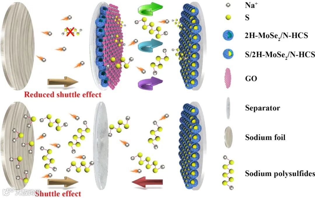 图1. 2H-MoSe2/N-HCS/GO功能化的隔膜抑制室温钠硫电池多硫化物穿梭效应示意图。