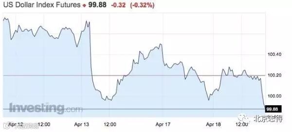 特朗普在4月13日接受华尔街日报采访时说,“美元太强了”,再次口头干预汇市,美元指数跌破100大关。努钦关于长期将支持强美元的表态虽然提振了美股,市场却普遍担心税改的前景,美元再次跌破100。