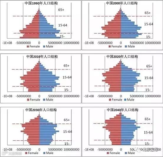 下面这组图片则是从1990年到2040年五十年间老龄化演变的过程分析:
