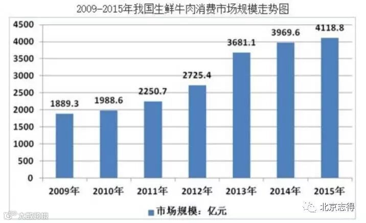 中国的牛肉市场规模在2010年以后开始呈现出井喷状态。中经先略的报告显示,2015年,中国的生鲜牛肉消费规模达到4118.8亿元,超过了2010年时的两倍。这其中进口牛肉也占据了很高比重。据北京青年报消息,中国去年牛肉进口量达到82.5万吨,金额约26亿美元。而2003年,全年牛肉进口量仅为1500万美元,相差173倍!
