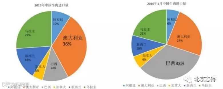 根据MIG集团数据,2016年1月,巴西成为中国最大的牛肉来源国,份额从2015年的13%猛增至33%,而澳大利亚退居第二。