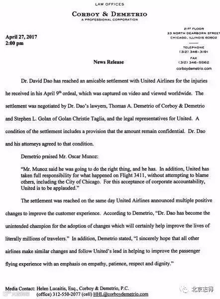美联航方面同样发表了一份简短的声明,称非常愉悦地向公众报告,美联航已友善地解决了发生在4月9日美联航3411航班上的不幸事件。