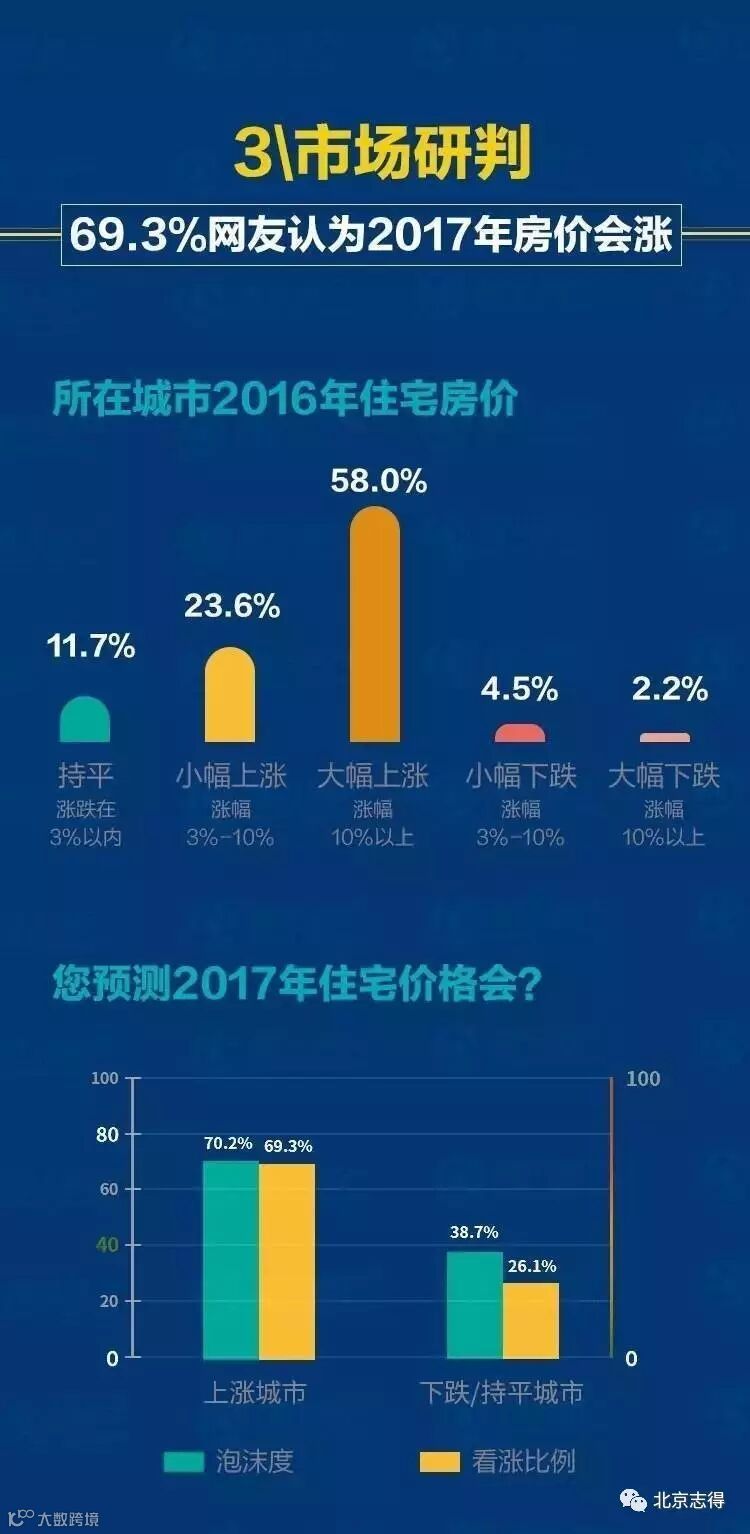 报告显示,中国购房群体对楼市看法的博弈依然很大,69.3%网友认为2017年房价会出现小幅上涨。