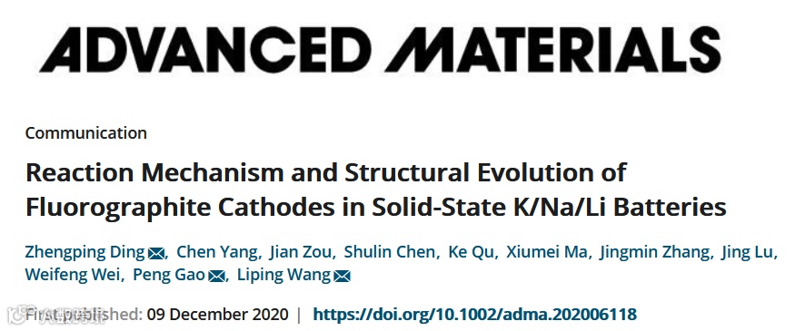 近日,北京大学Zhengping Ding,高鹏研究员与电子科技大学王丽平副教授等合作。在国际顶级期刊Advanced Materials上发表题为“Reaction Mechanism and Structural Evolution of Fluorographite Cathodes in Solid‐State K/Na/Li Batteries”的研究工作。