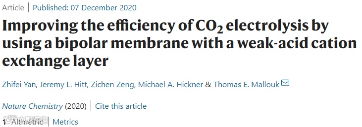 Nature Chemistry: 利用带有弱酸阳离子交换层的双极膜提高CO2电解效率 科学材料站