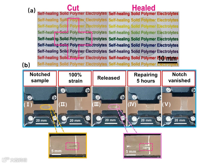 此外,固态聚合物电解质可以通过机械应变抑制锂枝晶生长,为锂金属负极的使用提供基础。具有良好柔韧性的有机聚合物易于剪裁、加工,为可穿戴电子器件的开发提供了巨大支撑。然而,厚度在数十微米到数百微米级别的固态聚合物电解质膜在装配和使用过程中,受到外力作用容易开裂或损坏,这可能导致电池故障。因此,自修复材料可以在受到破坏时修复受损部位,延长使用寿命,被认为是高性能固态聚合物电解质的理想选择。