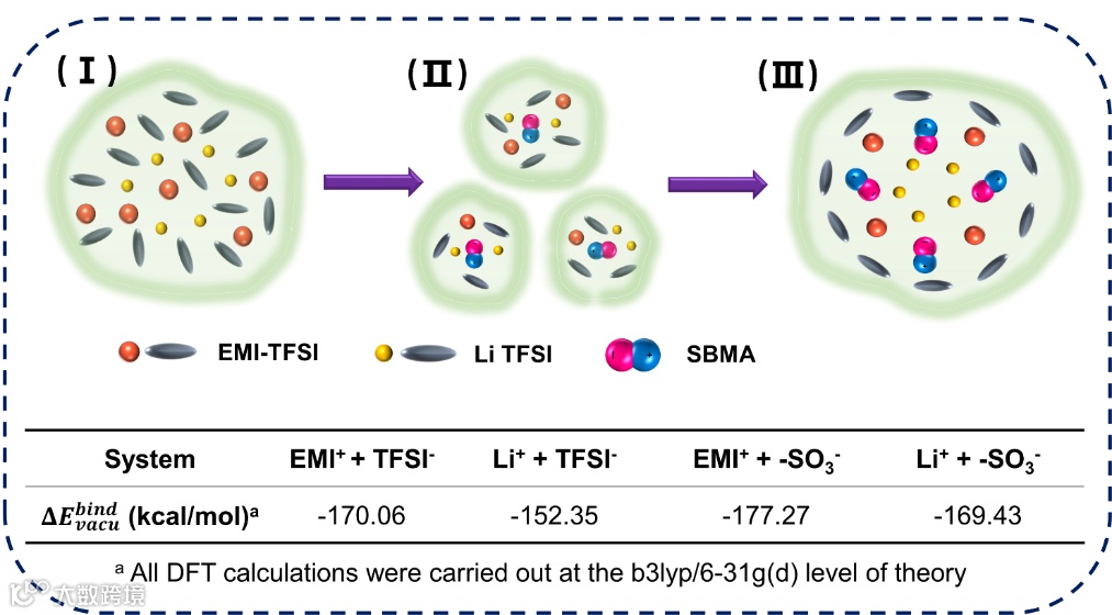 在SHSPE中引入SBMA之后,密度泛函理论(DFT)计算表明,磺酸盐对Li+的静电吸引力更大( = -169.43 kcal/mol),会干扰TFSI-和Li+的原始离子氛围(图3,表格),从而释放和促进Li+的迁移。此外,固定化的SBMA抑制了阴离子的移动,进一步促进Li+的解离和迁移。