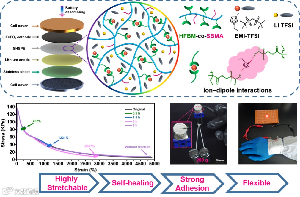 图1. 自修复固态聚合物电解质的离子-偶极作用、自修复性能、粘附性和柔性电池。