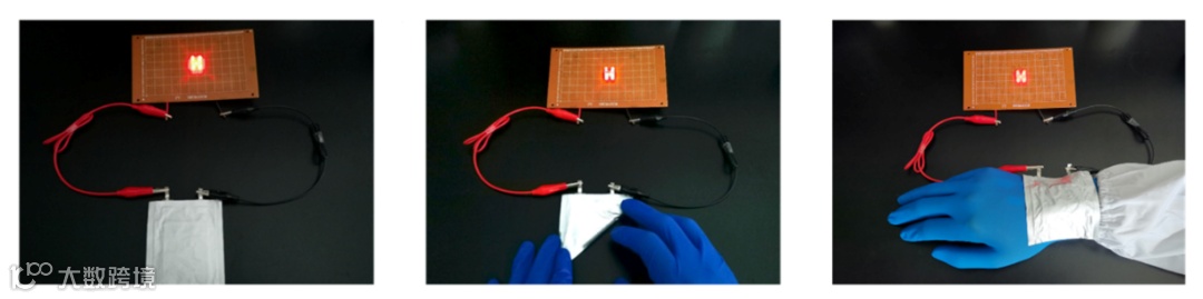 随着可穿戴设备的普及,柔性电池的开发也备受关注。文中将SHSPE应用于软包电池,在折叠、弯曲的情况下,均不影响其正常工作,这是SHSPE优异的自修复能力和电化学性能共同带来的结果。