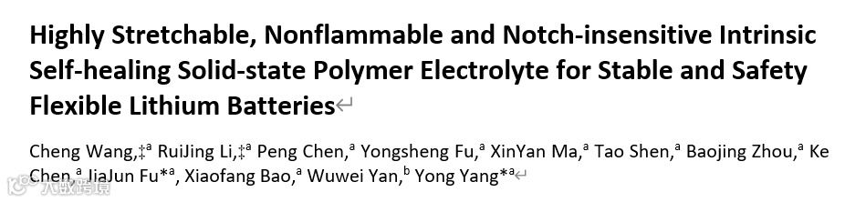 近日,来自南京理工大学的傅佳骏教授和杨勇副教授合作,在国际知名期刊Journal of Materials Chemistry A上发表题为“Highly Stretchable, Nonflammable and Notch-insensitive Intrinsic Self-healing Solid-state Polymer Electrolyte for Stable and Safety Flexible Lithium Batteries”的学术文章。