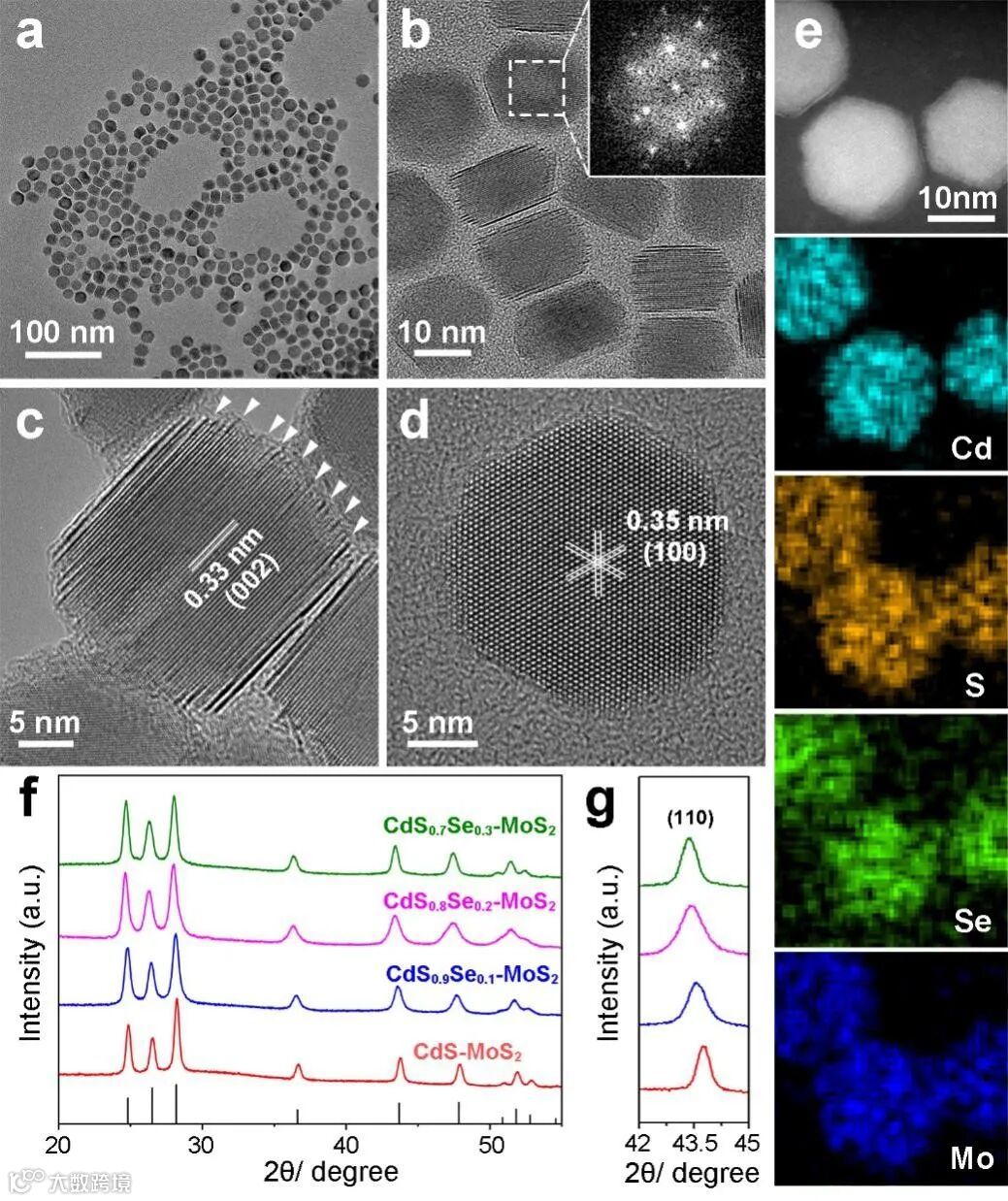 所制备的Cu2−χSySe1−y-MoS2可以作为模板,通过阳离子交换的方法转化为CdSySe1−y-MoS2。且得到的CdSySe1−y-MoS2可以保持原有的形貌不变,MoS2纳米片仍然以边缘外延的方式存在于CdSySe1−y的表面。