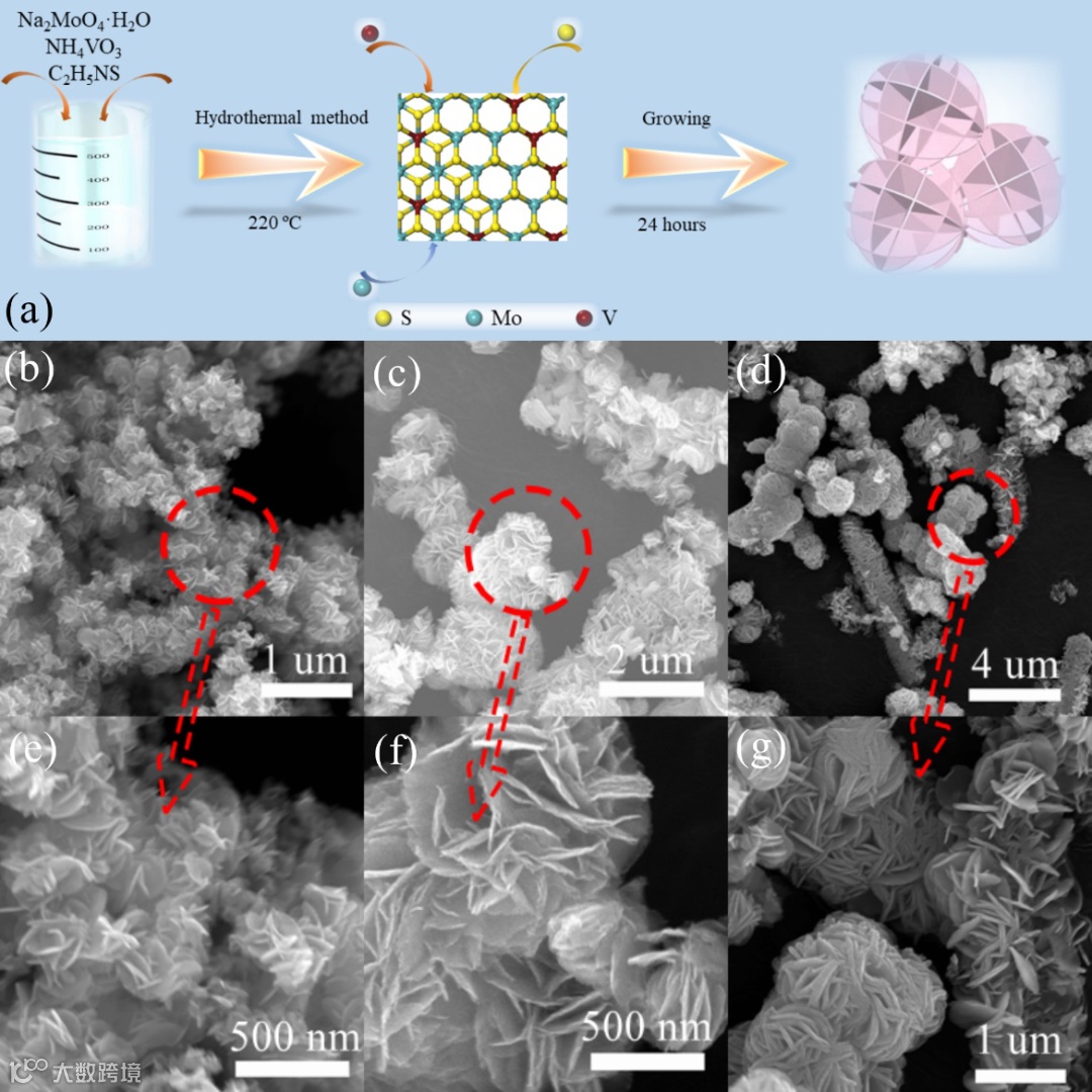 钒调控二硫化钼通过简单的一步水热法制备。随着钒含量的增加,逐渐形成了花状结构颗粒,且颗粒尺寸也随之变大。
