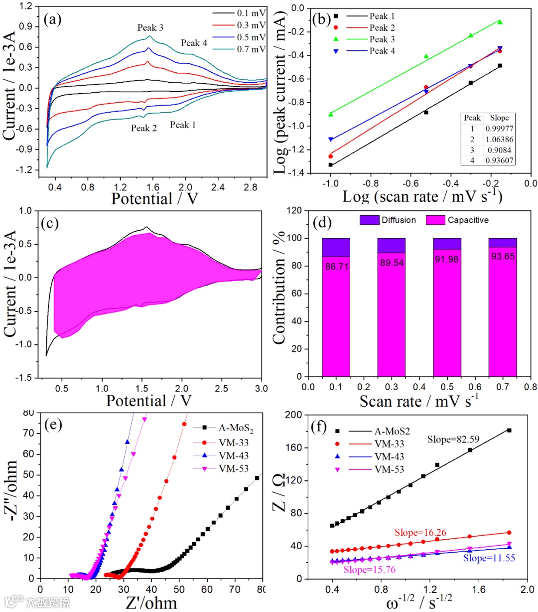 图5. (a-d) CV及赝电容占比分析, (e, f) 阻抗图谱。