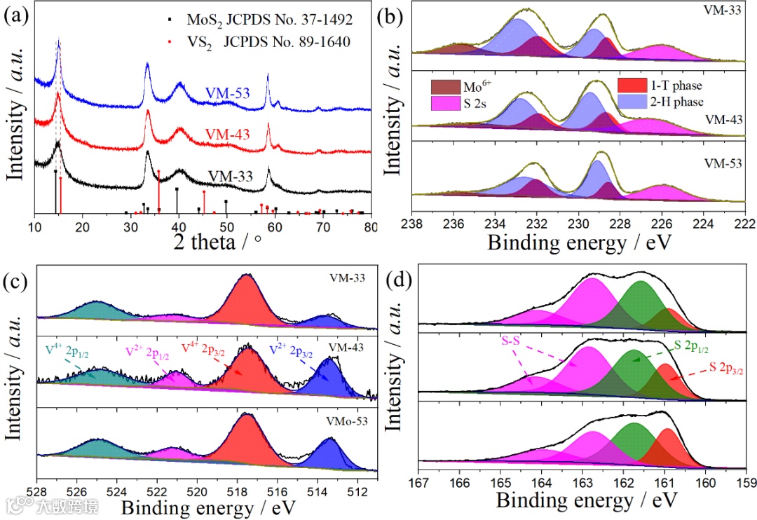图3. (a)XRD分析结果,(b-d) Mo, V以及S的高分辨XPS图谱。