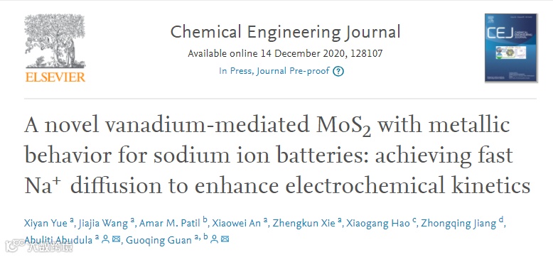 近日,来自日本国立弘前大学的官国清教授/阿布里提教授课题组联合国内太原理工大学郝晓刚教授课题组和浙江理工蒋仲庆教授课题组,在国际知名期刊Chemical Engineering Journal上发表题为“A novel vanadium-mediated MoS2 with metallic behavior for sodium ion batteries: achieving fast Na+ diffusion to enhance electrochemical kinetics”的文章。