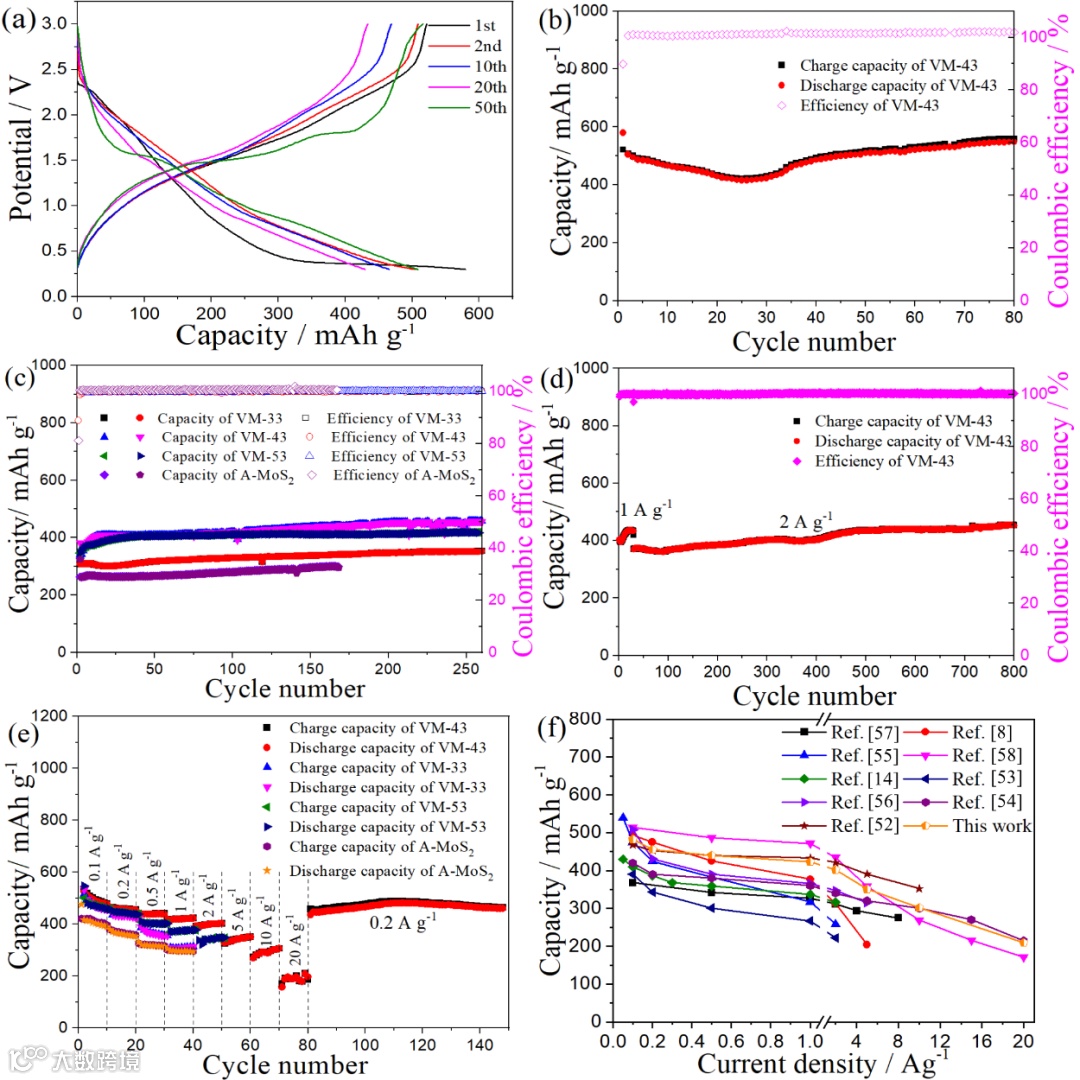 图4. (a)恒电流充放电图,(b-d) 不同电流密度下的稳定性,(e)倍率性能; (f)和其他基于二硫化钼负极的对比图。