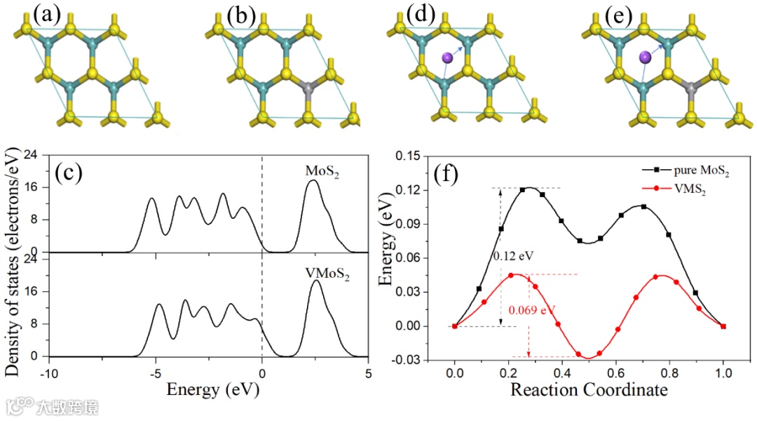 导读:本工作通过钒调控二硫化钼结构使该材料具备金属导电性从而导电性显著提高,并且通过DFT计算验证了钒调控后,钠离子传输能垒从0.12 eV降低到0.069 eV, 可以有效的促进钠离子在层间的迁移速率,从